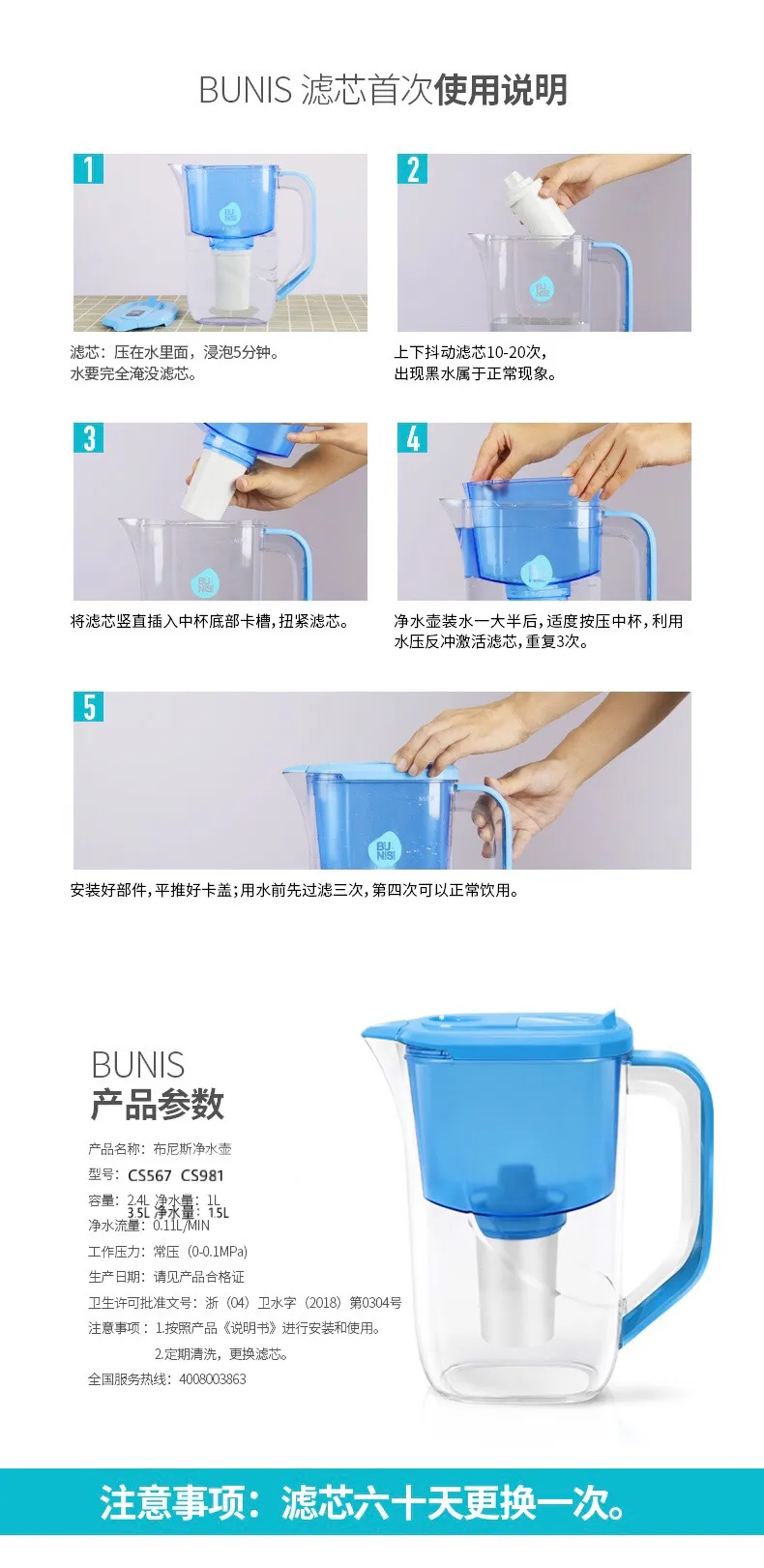 F2547 เหยือกน้ำแคมป์ปิ้ง Tap Water Filtration Kettle Household Water Purifier Water Filter Jug Portable Filter Element
