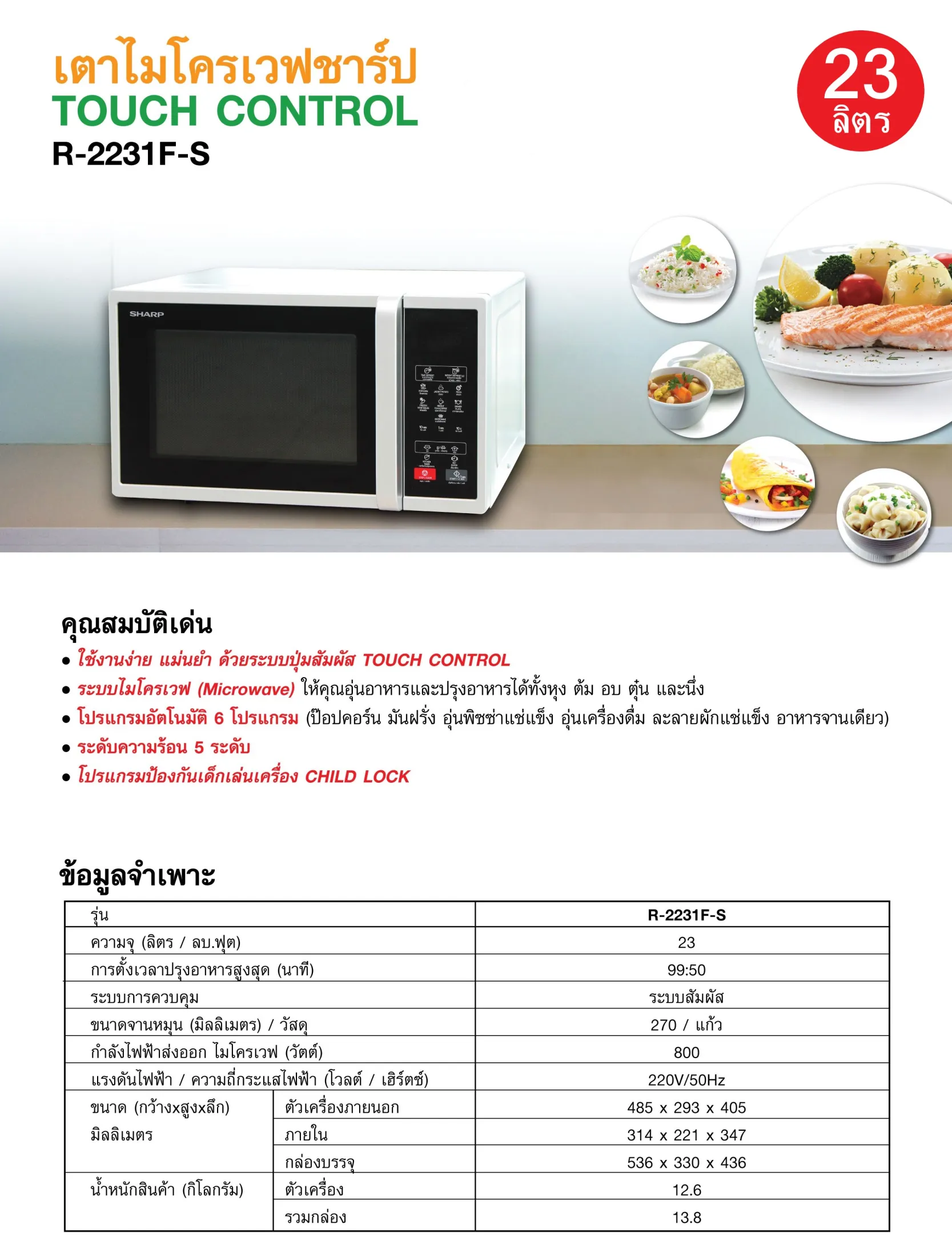 • โปรแกรมอัตโนมัติ 6 โปรแกรม (ป๊อปคอร์น มันฝรั่ง อุ่นพิชซ่าแช่แข็ง อุ่นเครื่องดื่ม ละลายผักแช่แข็ง อาหารจานเดียว)