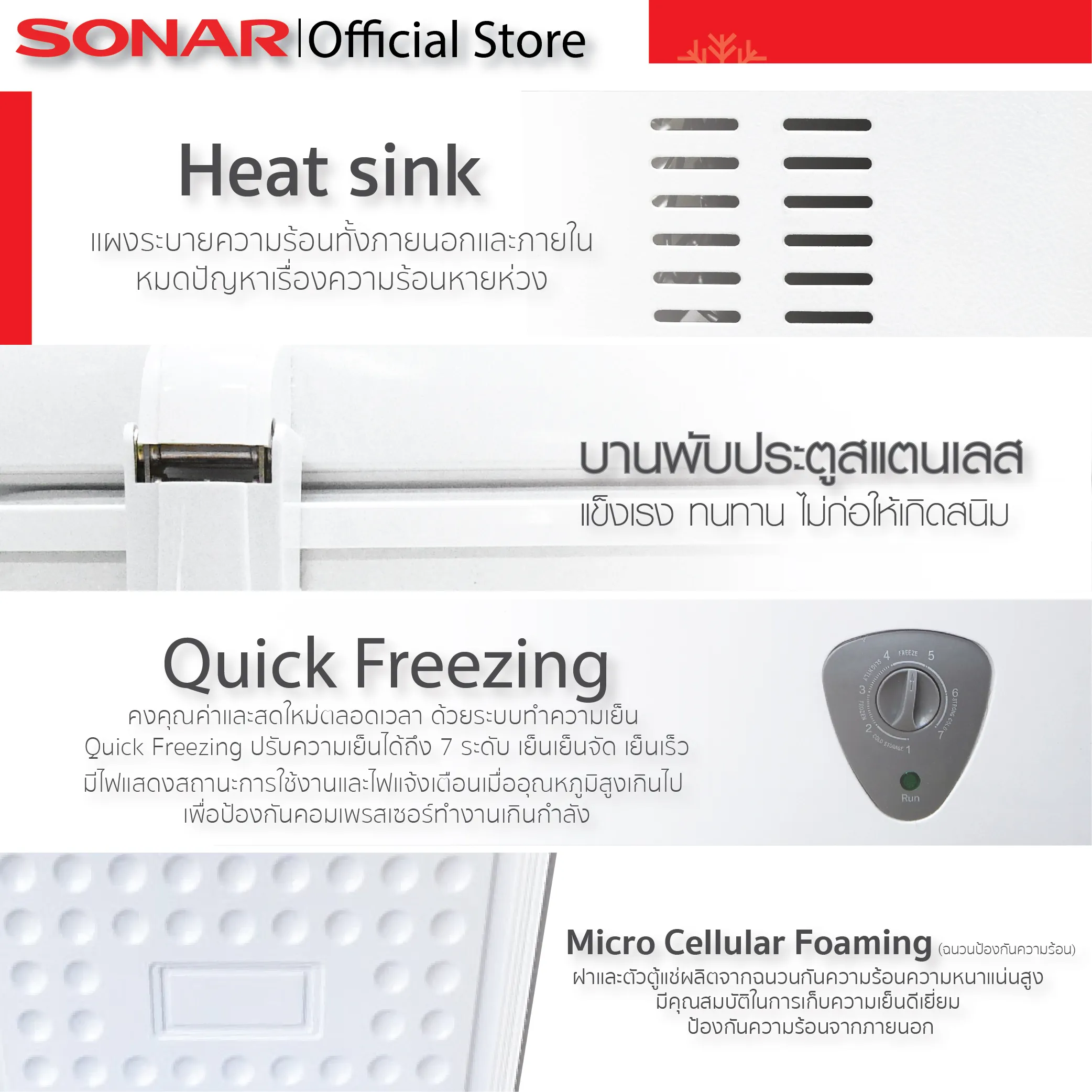 ประโยชน์ครบครันเก็บอาหารแช่แข็งและน้ำนมแม่ เพื่อให้คงคุณค่าและสดใหม่ตลอดเวลา เย็นจัด เย็นเร็ว เร่งความเย็นได้เพียงกดปุ่ม สะดวกสบายด้วยปุ่มควบคุมอุณหภูมิให้เหมาะกับ ประเภท และปริมาณของสินค้า ผนังตู้ผลิตจากอลูมิเนียมแท้ 100% ช่วยให้กระจายความเย็นได้ดี