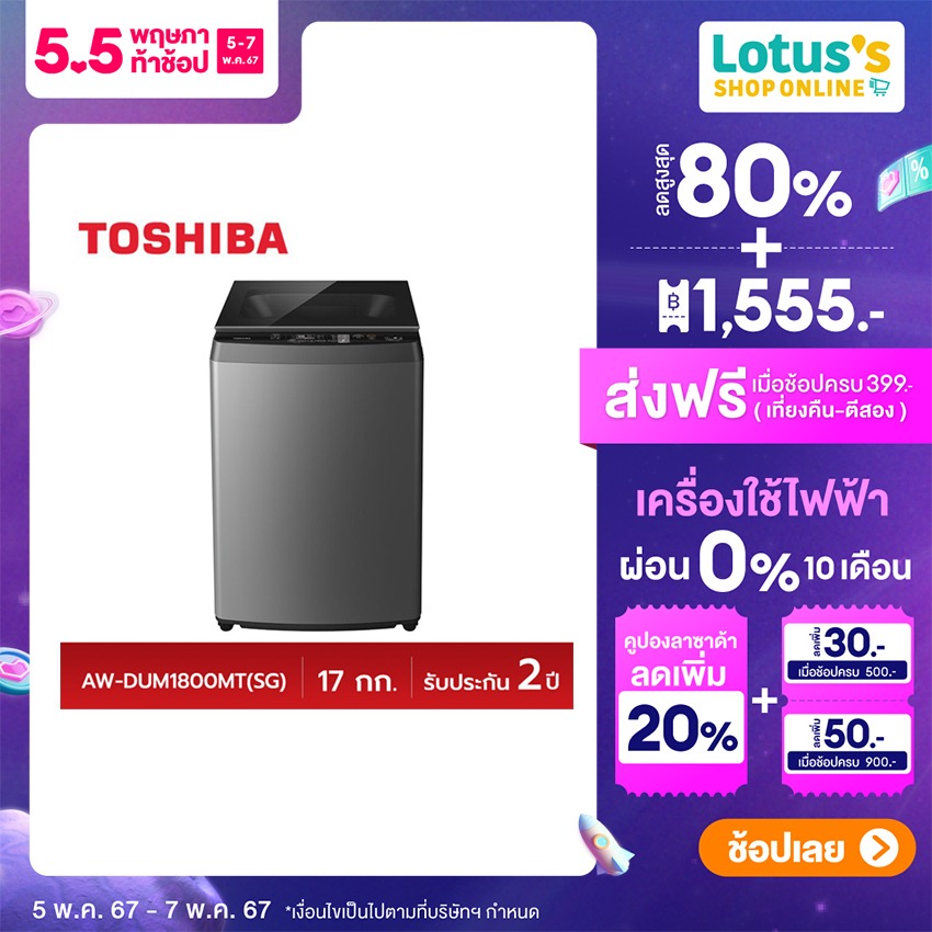 TOSHIBA โตชิบา เครื่องซักผ้าฝาบน ขนาด 17 กก. รุ่น AW-DUM1800MT(SG) สีเงิน