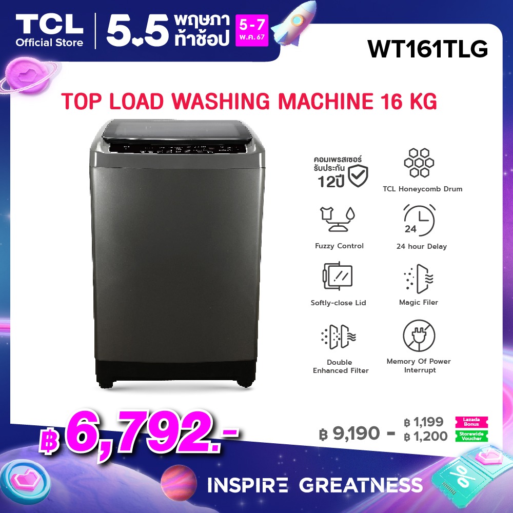F2597 NEW TCL เครื่องซักผ้าฝาบน ขนาด 16 Kg. สีเทา รุ่น WT161TLG ฝาครอบกระจกนิรภัย ปรับสมดุลถังอัตโนมัติ