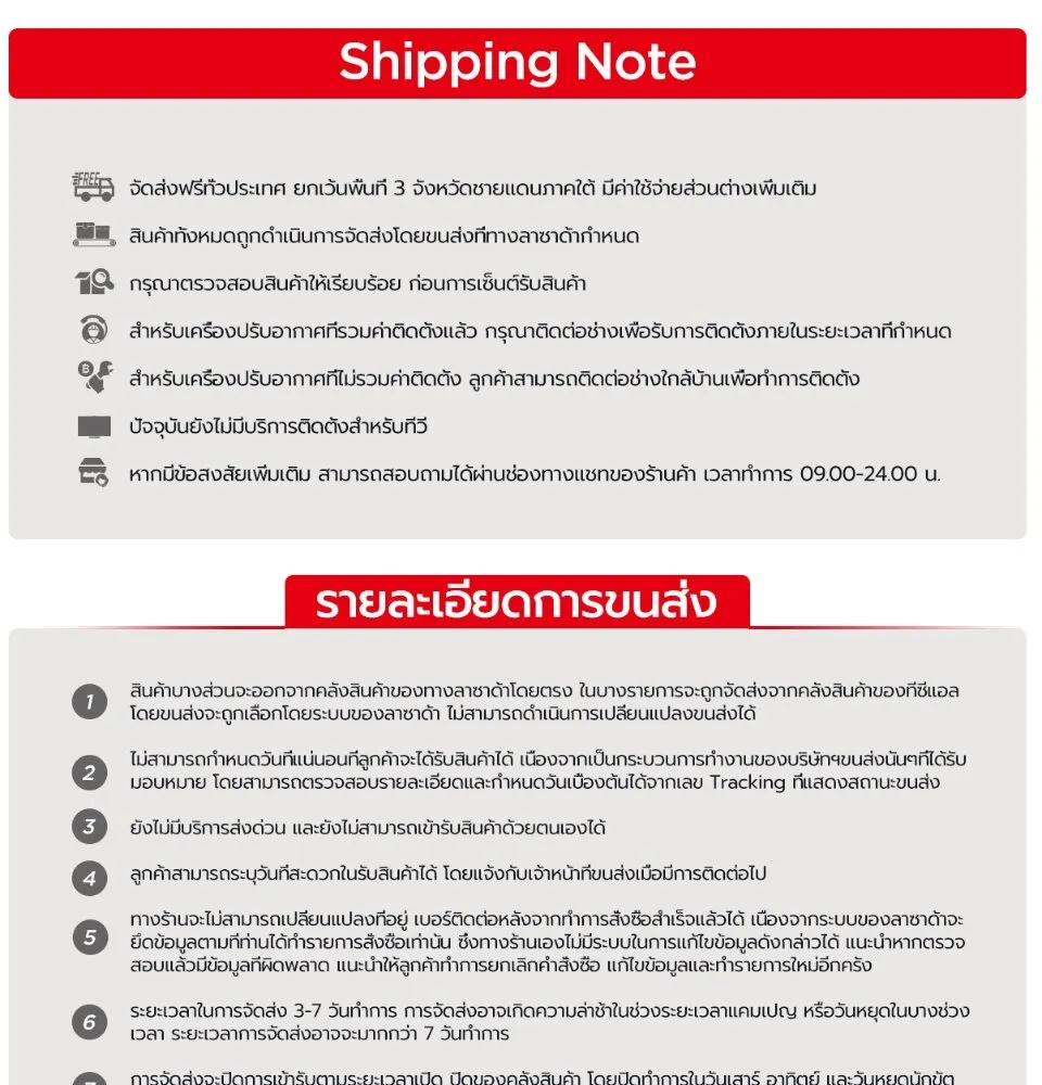 - หมายเหตุ : โปรดรักษาสิทธิ์ของท่านในการรับสินค้า เนื่องจากสินค้าในกลุ่มเครื่องใช้ไฟฟ้ามีราคาสูง หากท่านไม่ได้ถ่ายคลิปขณะแกะสินค้าเพื่อยืนยันความเสียหาย ถือว่าท่านได้ยอมรับสินค้านั้นแล้ว โดยที่ท่านจะไม่สามารถแจ้งคืนสินค้า, แจ้งเคลม หรือเรียกร้องความเสียหายใดๆได้