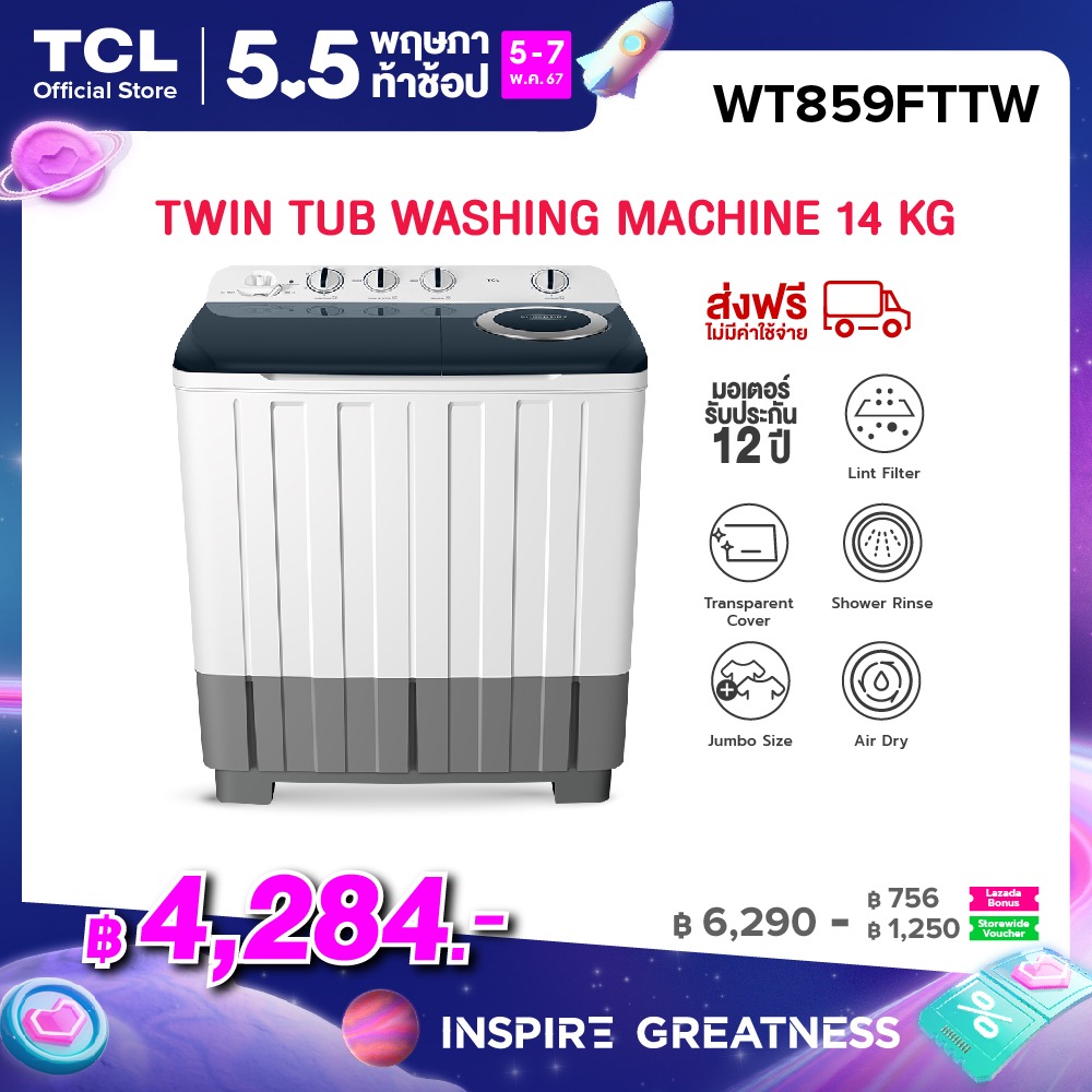 F2598 TCL เครื่องซักผ้า 2 ถัง Twin Tub ขนาด 14 กิโลกรัม พร้อมด้วยถังปั่นหมาดระบบ Air Dry รุ่น WT859FTTW
