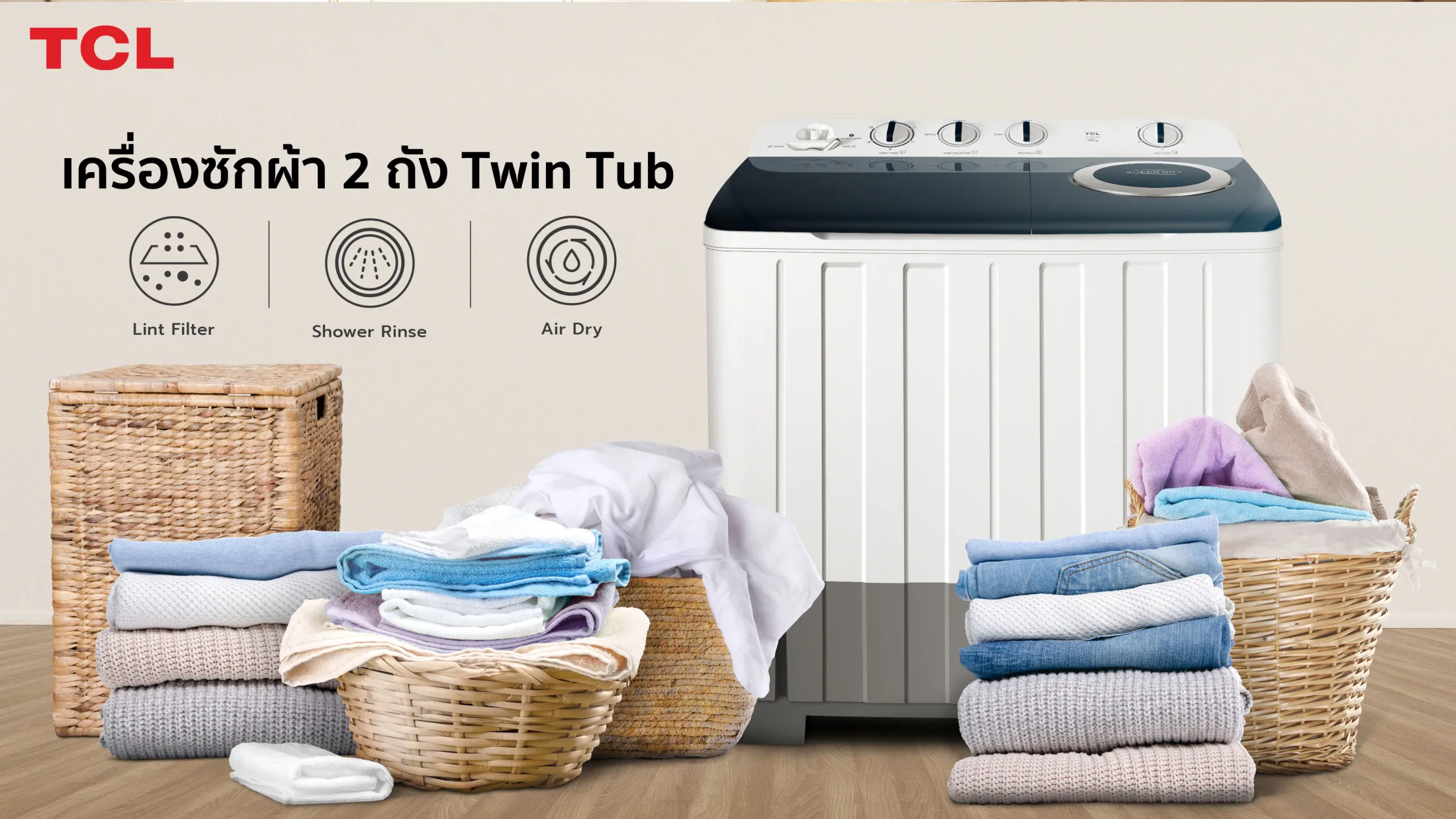 TCL เครื่องซักผ้า 2 ถัง Twin Tub ขนาด 14 กิโลกรัม พร้อมด้วยถังปั่นหมาดระบบ Air Dry รุ่น WT859FTTW