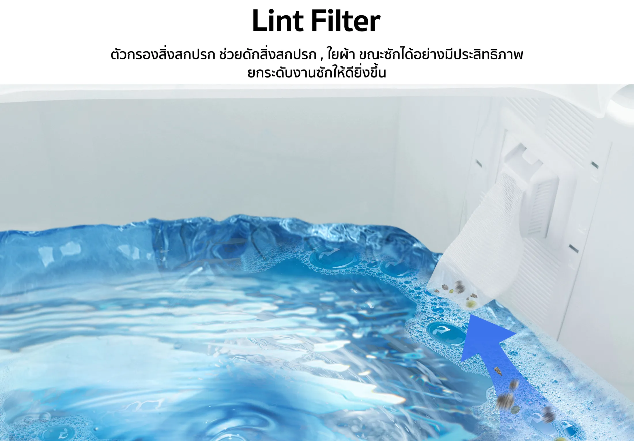 • Lint filter ช่องกรองที่มีประสิทธิภาพช่วยให้มั่นใจได้ว่าจะเก็บเศษผ้าหรือฝุ่นได้แม้ในระดับน้ำต่ำ ทำให้เสื้อผ้าของคุณดูสะอาดหลังซัก