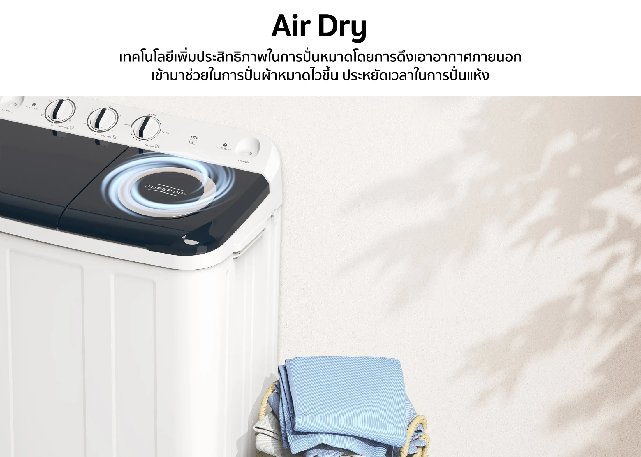 • Air dry เทคโนโลยีเพิ่มประสิทธิภาพในการปั่นหมาดดังนั้นคุณจึงมั่นใจได้ว่าเสื้อผ้าของคุณจะแห้งเร็วกว่าการปั่นแห้งเพียงอย่างเดียว
