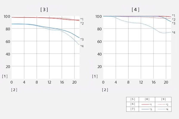 MTF (Modulation Transfer Function) อธิบายว่าเลนส์ให้รายละเอียดของภาพได้ดีเพียงใด โดยวัดจากระดับคอนทราสต์ที่ได้ระหว่างเส้นที่ห่างกันอย่างเหมาะสม [1] คอนทราสต์ (%) [2] ระยะทางจากศูนย์กลางออปติคอลของเลนส์ (มม.) [3] รูรับแสงสูงสุด [4] รูรับแสง F8 [5] ความถี่เชิงพื้นที่ [6] 10 คู่บรรทัด / มม. [7] 30 คู่บรรทัด / มม. [8] ค่า Radial [9] ค่า Tangential