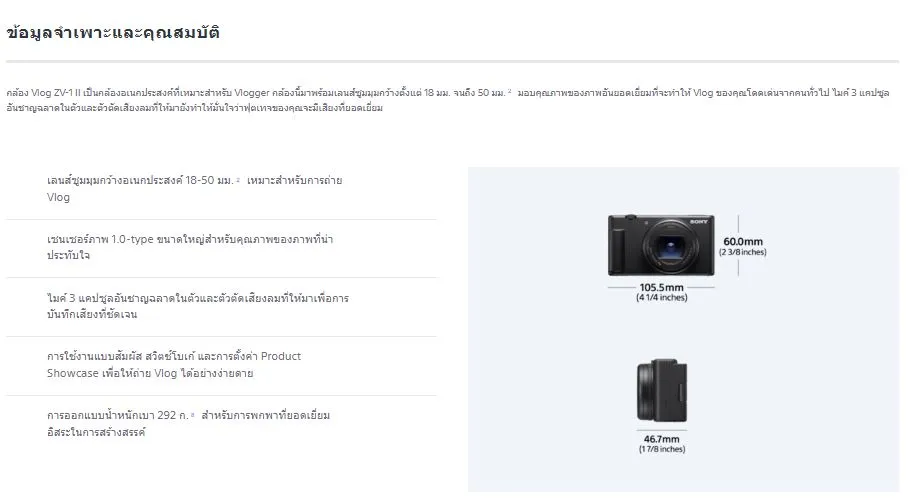 - Sony Vlog Camera รุ่น ZV-1 II- เซนเซอร์ Exmor RS CMOS ขนาด 1 นิ้ว ความละเอียด 20.1MP- เลนส์ ZEISS ที่ได้รับการออกแบบใหม่ ระยะ 18-50 มม. f/1.8-4.0- คุณภาพวิดีโอ 4K 30p FHD 120p- ระบบโฟกัส Fast Hybri AF โฟกัสดวงตามนุษย์และสัตว์- การติดตามวัตถุ Real-time Tracking- การตั้งค่า Cinematic VLOG- มี ND Filter ในตัว ปรับได้ 3 สต็อป- ฟีเจอร์ Bokeh Switch และ Product Showcase- ฟีเจอร์ Creative Look- โปรไฟล์สีภาพ/วิดีโอ S-log3 และ S-Gamut3.Cine- ระบบป้องกันภาพสั่นไหว Electronic/โหมด Active- รองรับการไลฟ์สตรีมด้วย USB-C- ไมโครโฟนอัจฉริยะ 3 แคปซูล ปรับทิศทางได้ พร้อม Deadcat กันลม- หน้าจอ LCD Touchscreen พับก้มเงยได้รอบทิศทาง- แบตเตอรี่ NP-BX1- น้ำหนัก 292 กรัม
