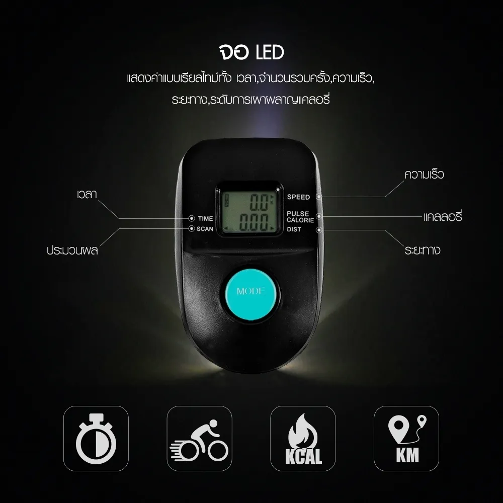- หน้าจอ LED แสดง เวลา, ความเร็ว ระยะทางสะสม, แคลอรี่