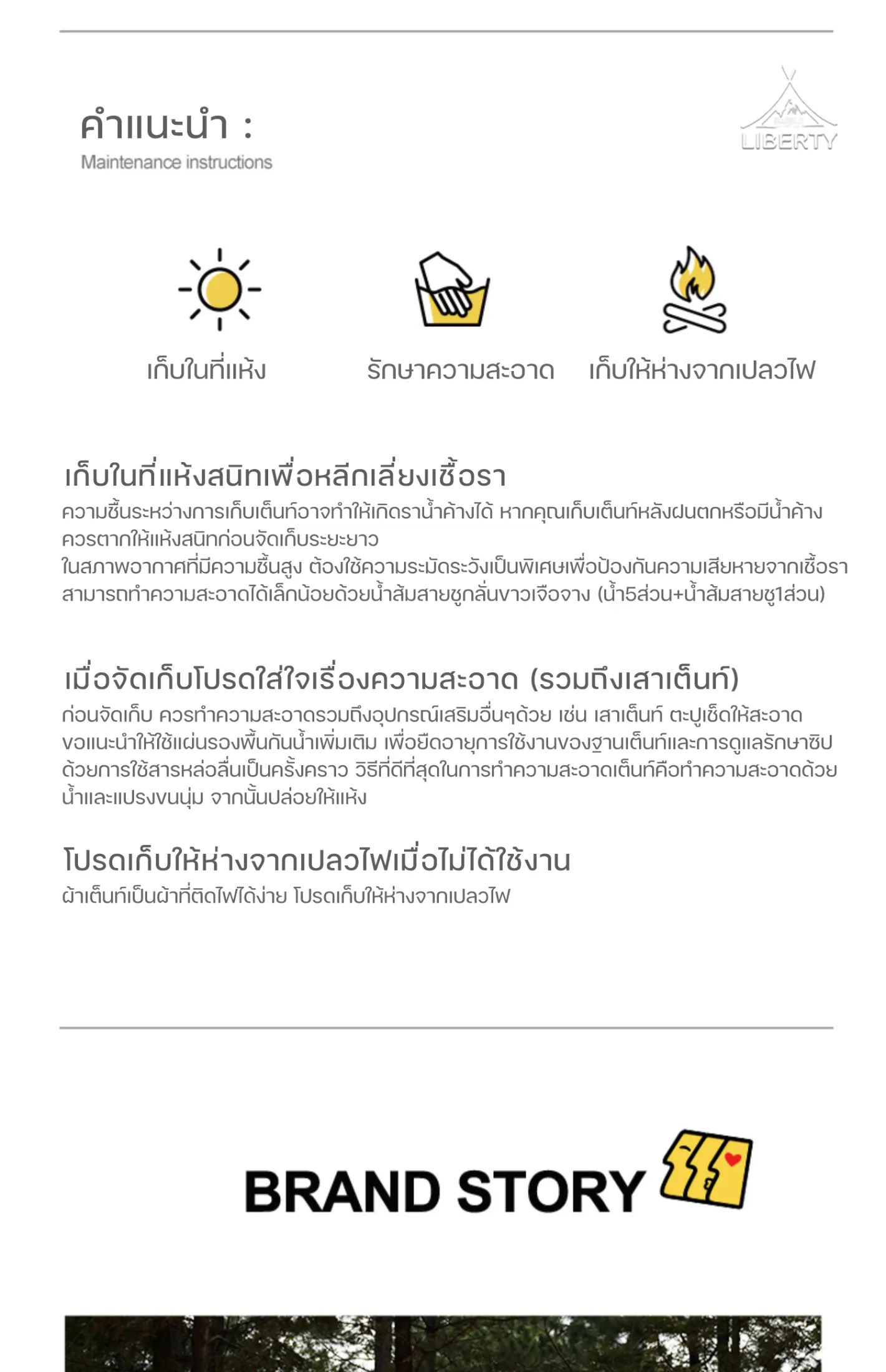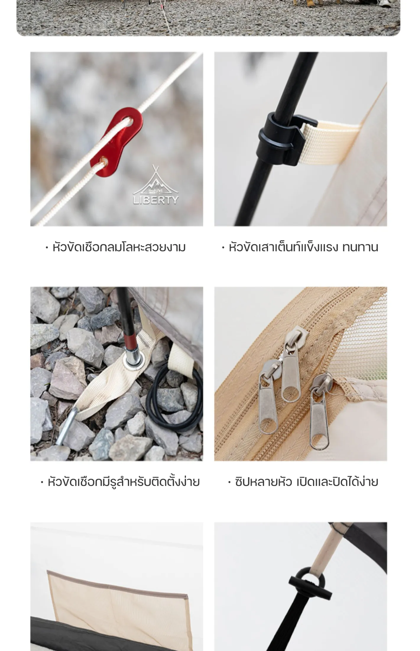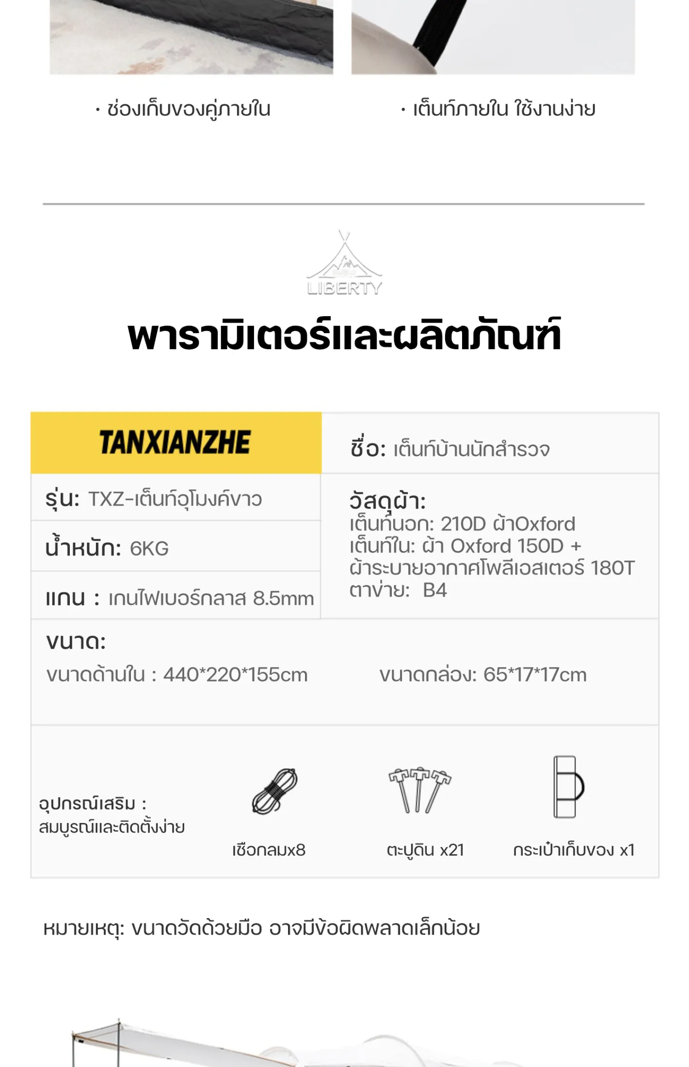 เต็นท์ขนาด: 440 X 220 X 155 cm หลังคายาว: 65 X 17 X 17 cm น้ำหนักสุทธิ: 6 Kg. ดัชนีการกันน้ำ: PU2000 + mm. ผ้าเต็นท์เต็นท์: Oxford 210D/ Oxford 150D + ผ้าระบายอากาศโพลีเอสเตอร์ 180T พารามิเตอร์เสาเต็นท์เต็นท์: เสาไฟเบอร์กลาส 〖อุปกรณ์เสริมผลิตภัณฑ์〗 『เชือกกันลม X 8 เล็บพื้น X 21 ถุงเก็บ X 1』