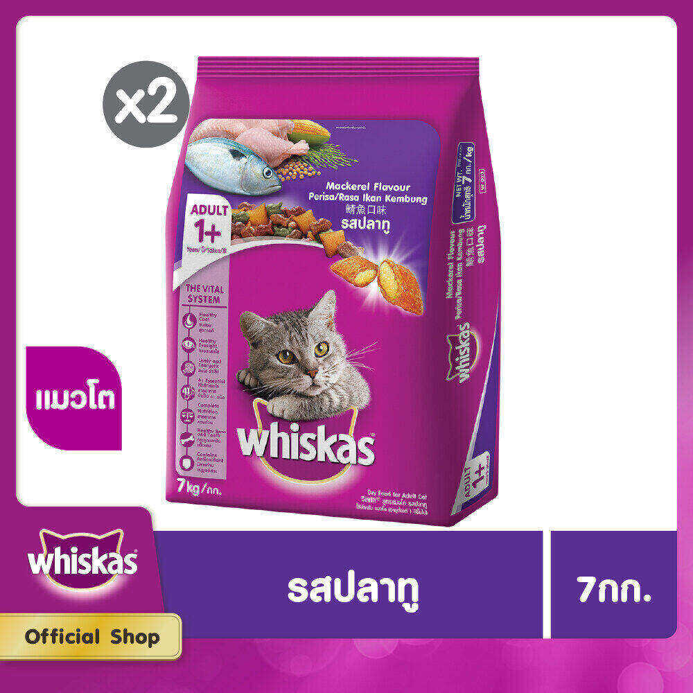 ● การซื้อแต่ละครั้งจะมาพร้อมกับถุงอาหารแมวโต WHISKAS ขนาด 7 กก. จำนวน 2 ถุง มีรสชาติให้เลือก รสปลาทะเล ทูน่า หรือแมคเคอเรล