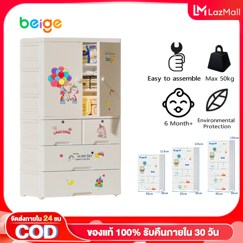 F634 Beige ตู้เสื้อผ้าเด็ก ตู้เสื้อผ้า ลายการ์ตูน เคลื่อนย้ายสะดวก หยัดพื้นที่ ตู้เก็บของ ปลอดสารพิษ ที่เก็บของประตูคู่และลิ้นชัก