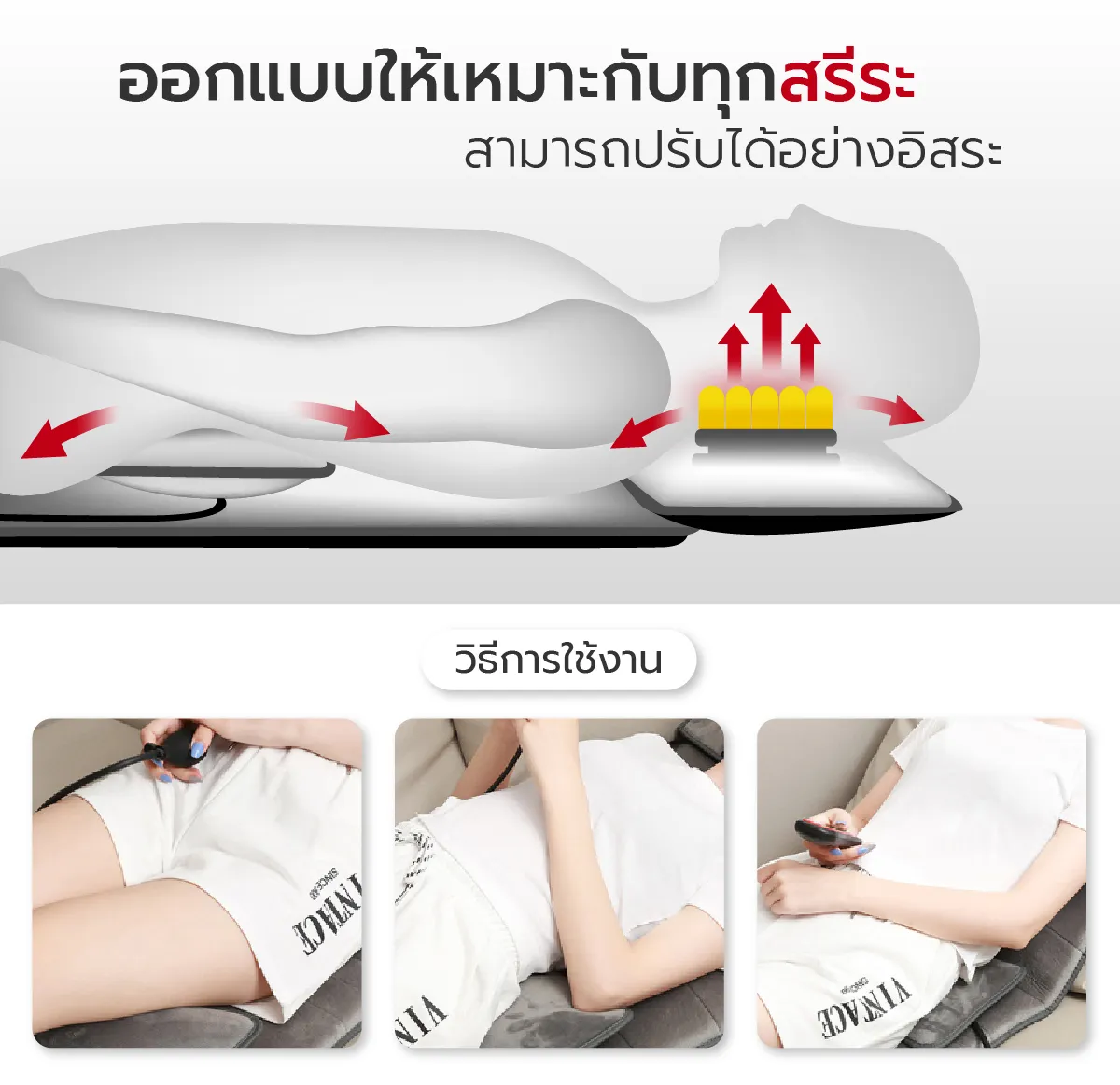 วิธีการใช้ : ใช้สำหรับนวดตัวทั่วร่างกาย เพียงกางเตียงนวดไฟฟ้าออกมาเสียบปลั๊ก สามารถนวดได้ทันที ปรับการโหมดได้ง่ายๆด้วยรีโมท