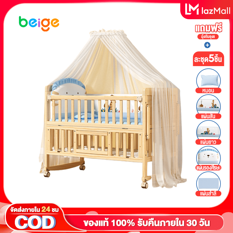 F658 Beige เตียงเด็ก เตียงนอนเด็ก เตียงไม้เด็ก เตียงไม้สน เตียงเด็ก พร้อมล้อ สามารถต่อเป็นเตียงผู้ใหญ่ เตียงอเนกประสงค์