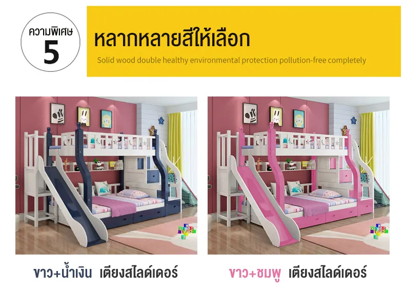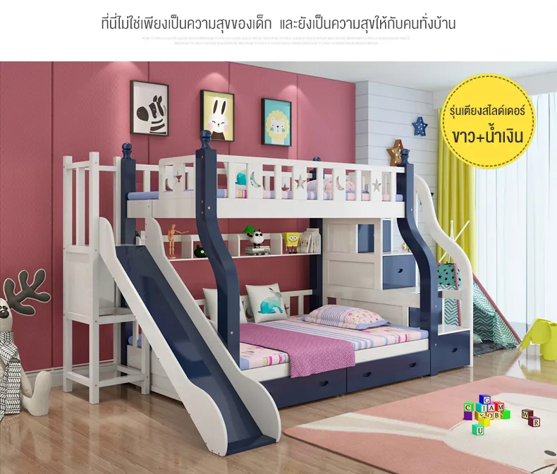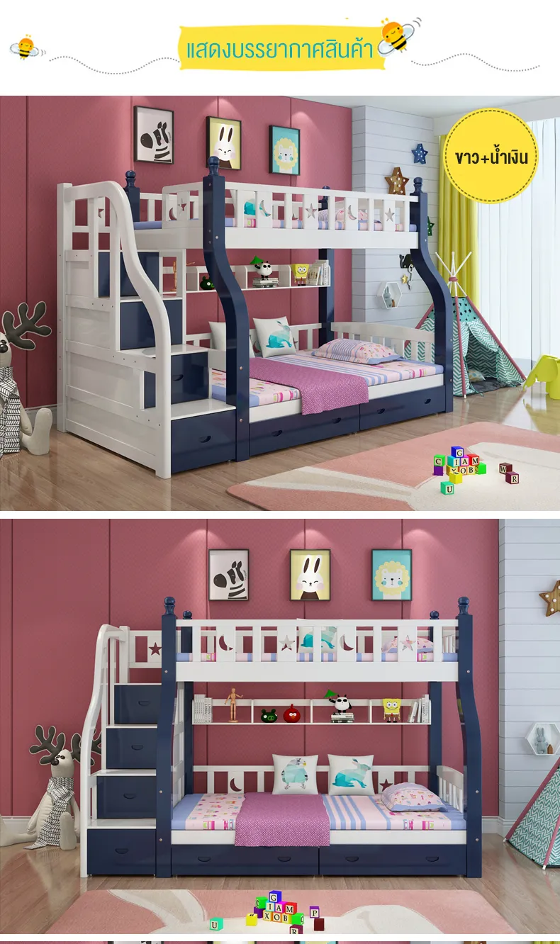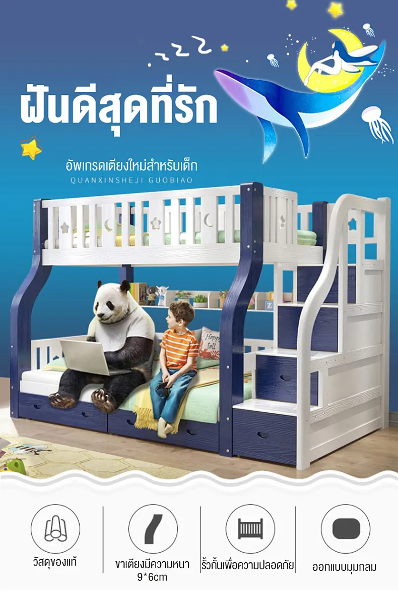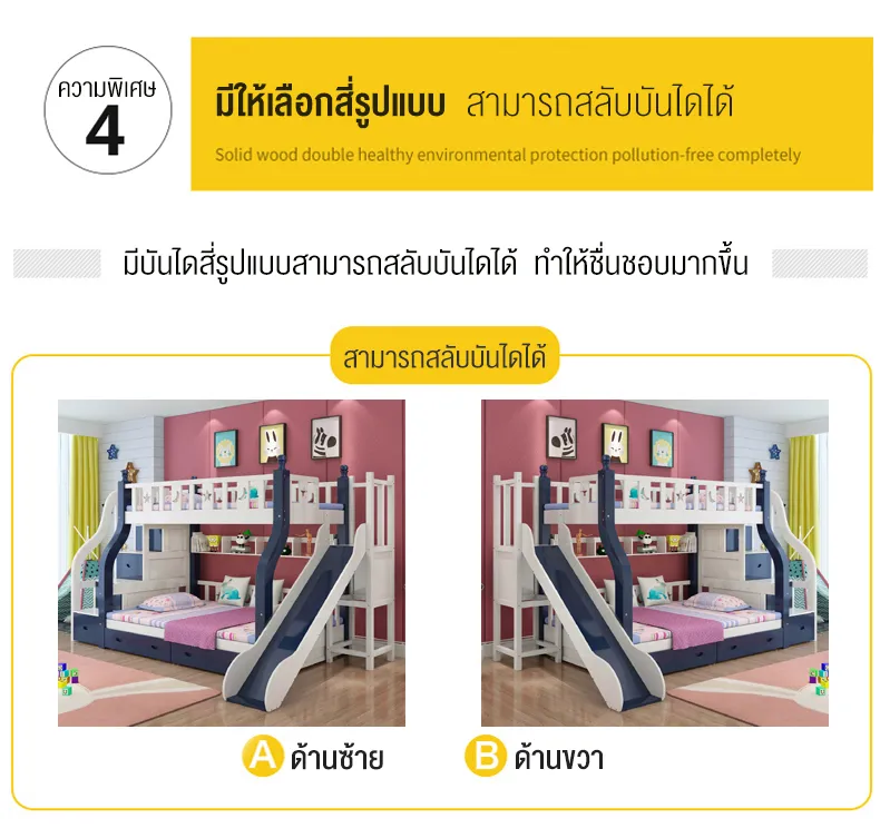 - ออกแบบรั้วเตียงสูงเพื่อความปลอดภัย- เตียงล่างเปลี่ยนเป็นโต๊ะเขียนหนังสือได้- บันไดแข็งแรงปลอดภัยและเป็นตู้เก็บของในตัว- มีชั้นวางหนังสือด้านล่างเตียงบน
