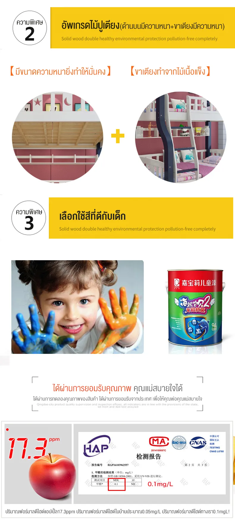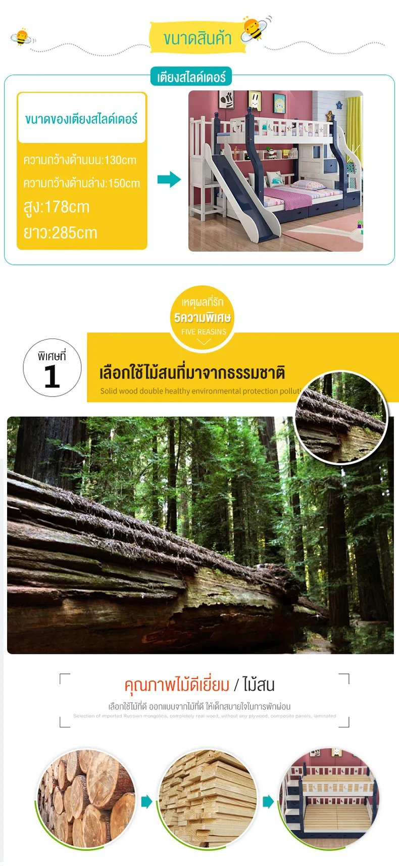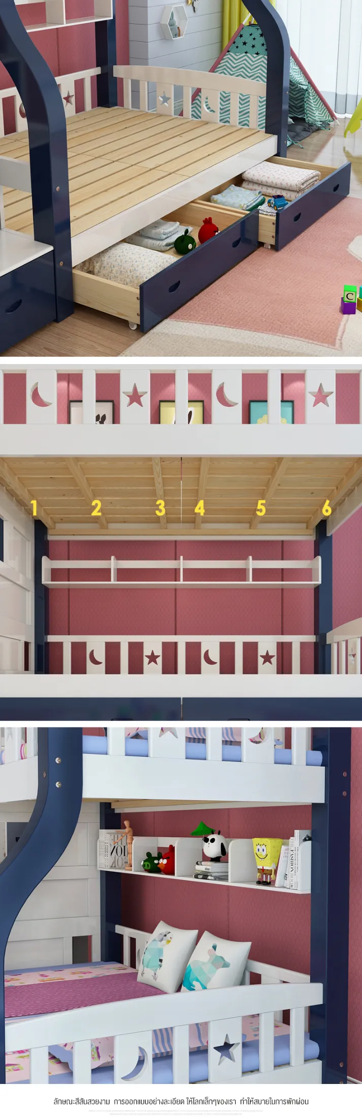 - ออกแบบรั้วเตียงสูงเพื่อความปลอดภัย- เตียงล่างเปลี่ยนเป็นโต๊ะเขียนหนังสือได้- บันไดแข็งแรงปลอดภัยและเป็นตู้เก็บของในตัว- มีชั้นวางหนังสือด้านล่างเตียงบน