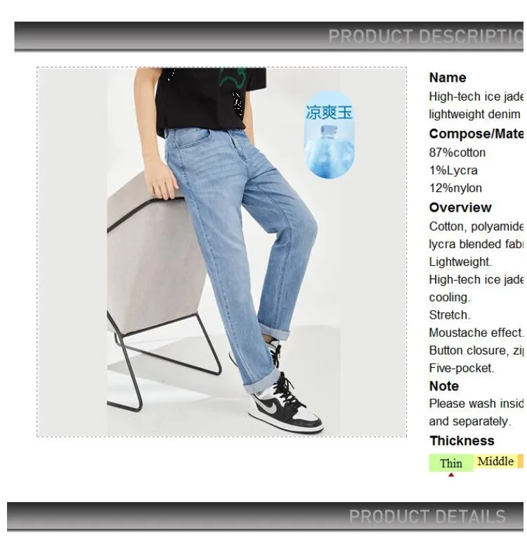 - Cotton, polyamide and lycra blended fabric. Lightweight. High-tech ice jade cooling. Stretch. Moustache effect. Button closure, zip fly. Five-pocket.