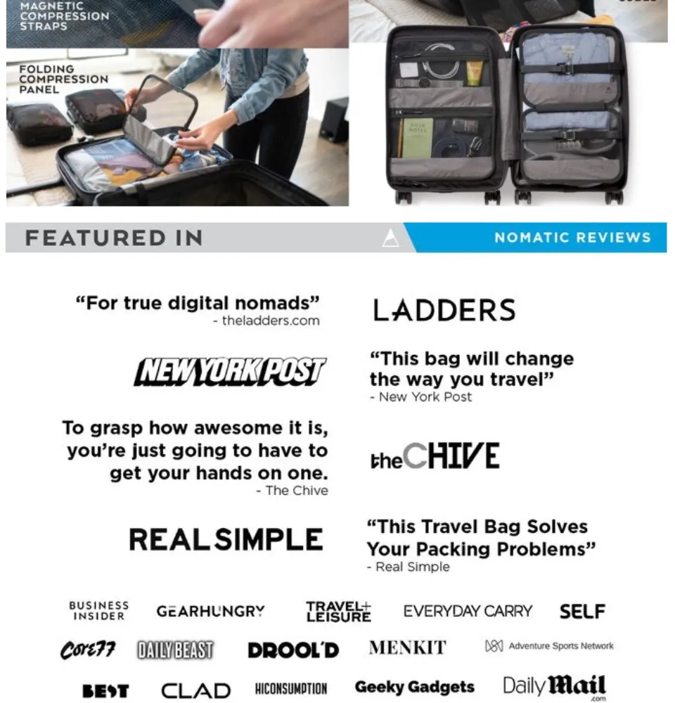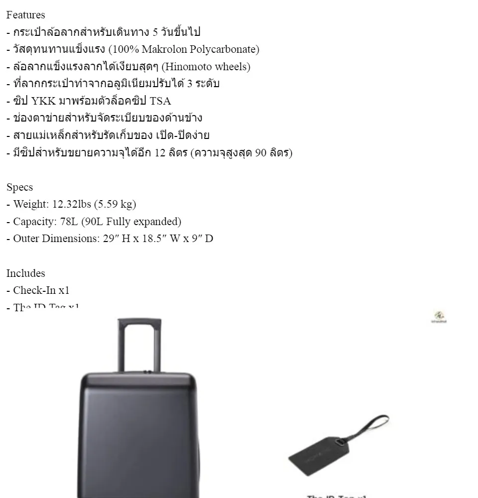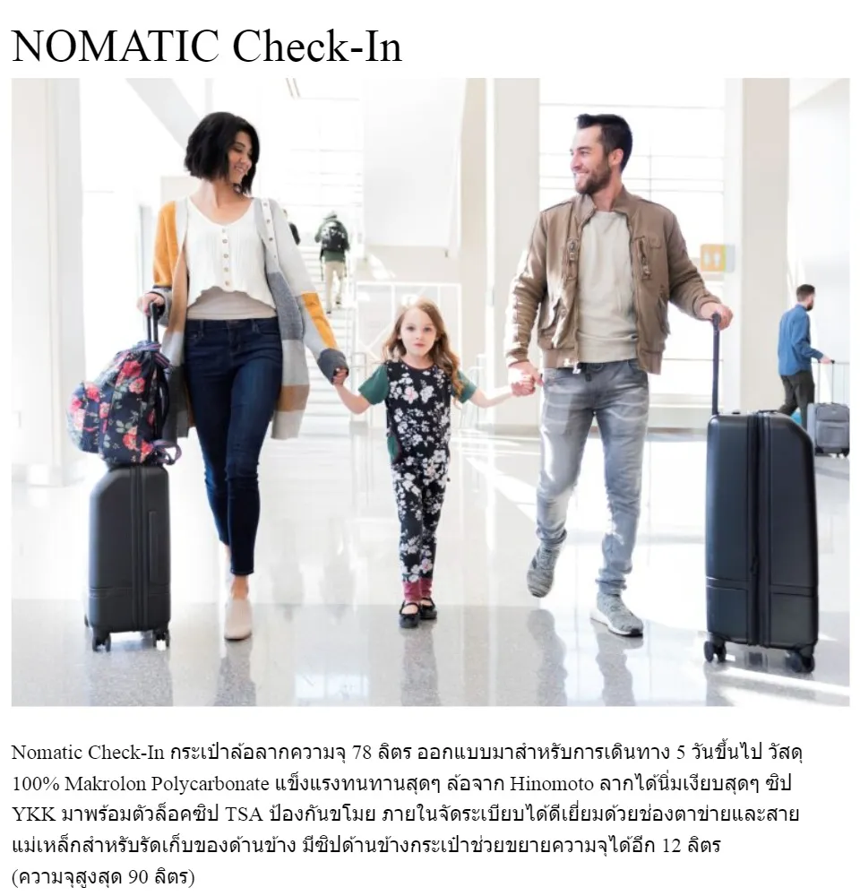 • Check-In จากแบรนด์ Nomatic กระเป๋าล้อลากความจุ 78-90 ลิตร สำหรับการเดินทาง 5 วันขึ้นไป วัสดุแข็งแรงทนทาน ล้อจาก Hinomoto ลากได้นิ่มเงียบสุดๆ ซิป YKK มาพร้อมตัวล็อคซิป TSA ภายในจัดระเบียบได้ดีเยี่ยม