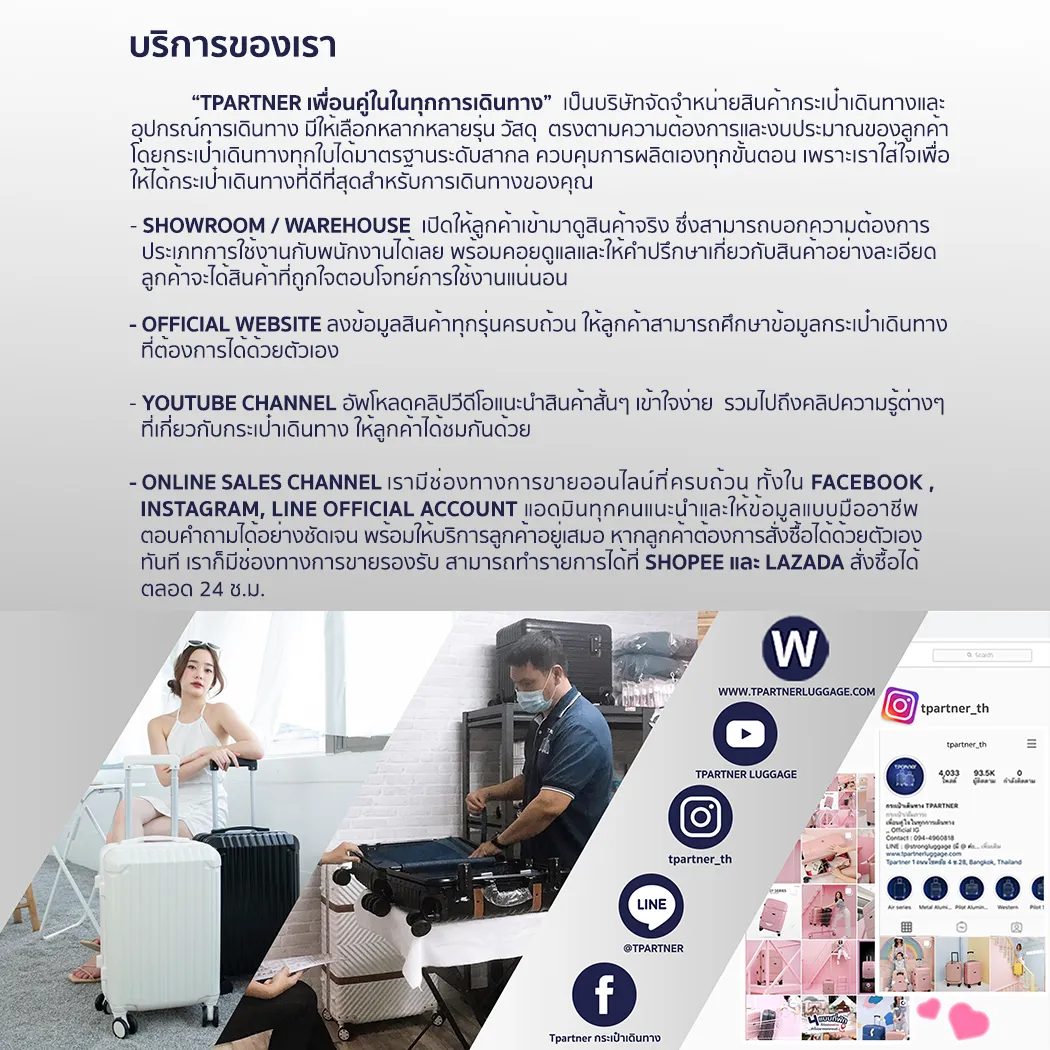 ► รับประกันอะไหล่ 1 ปีเต็ม  (ล้อ คันชัก ด้ามจับ และตัวล็อค) สามารถตรวจสอบเงื่อนไขการรับประกันได้ที่ https://www.tpartnerluggage.com/warranty