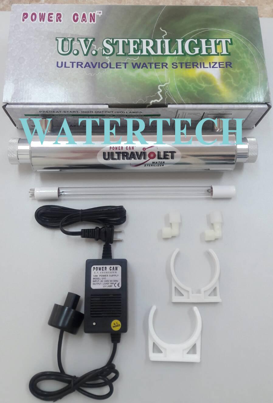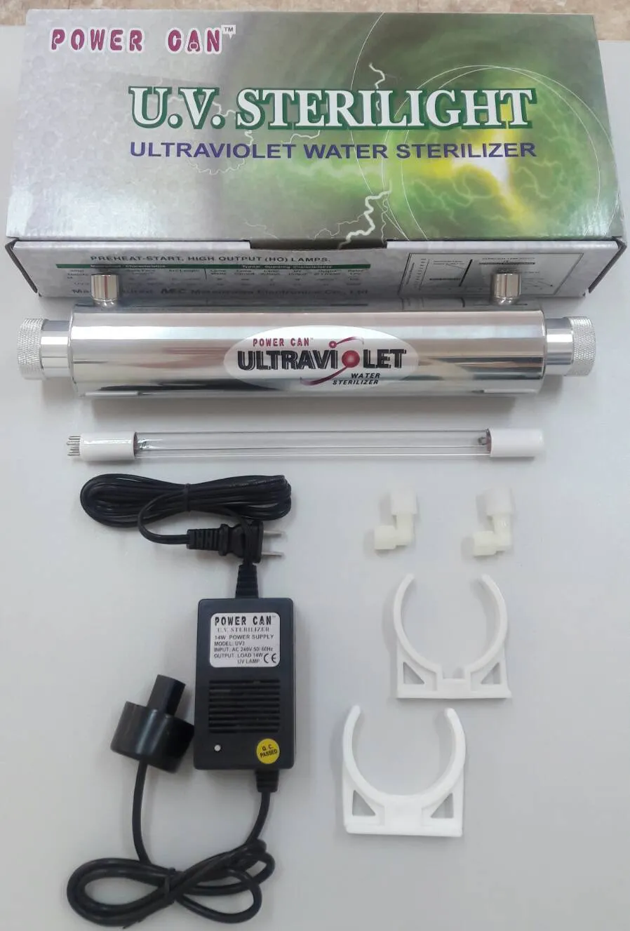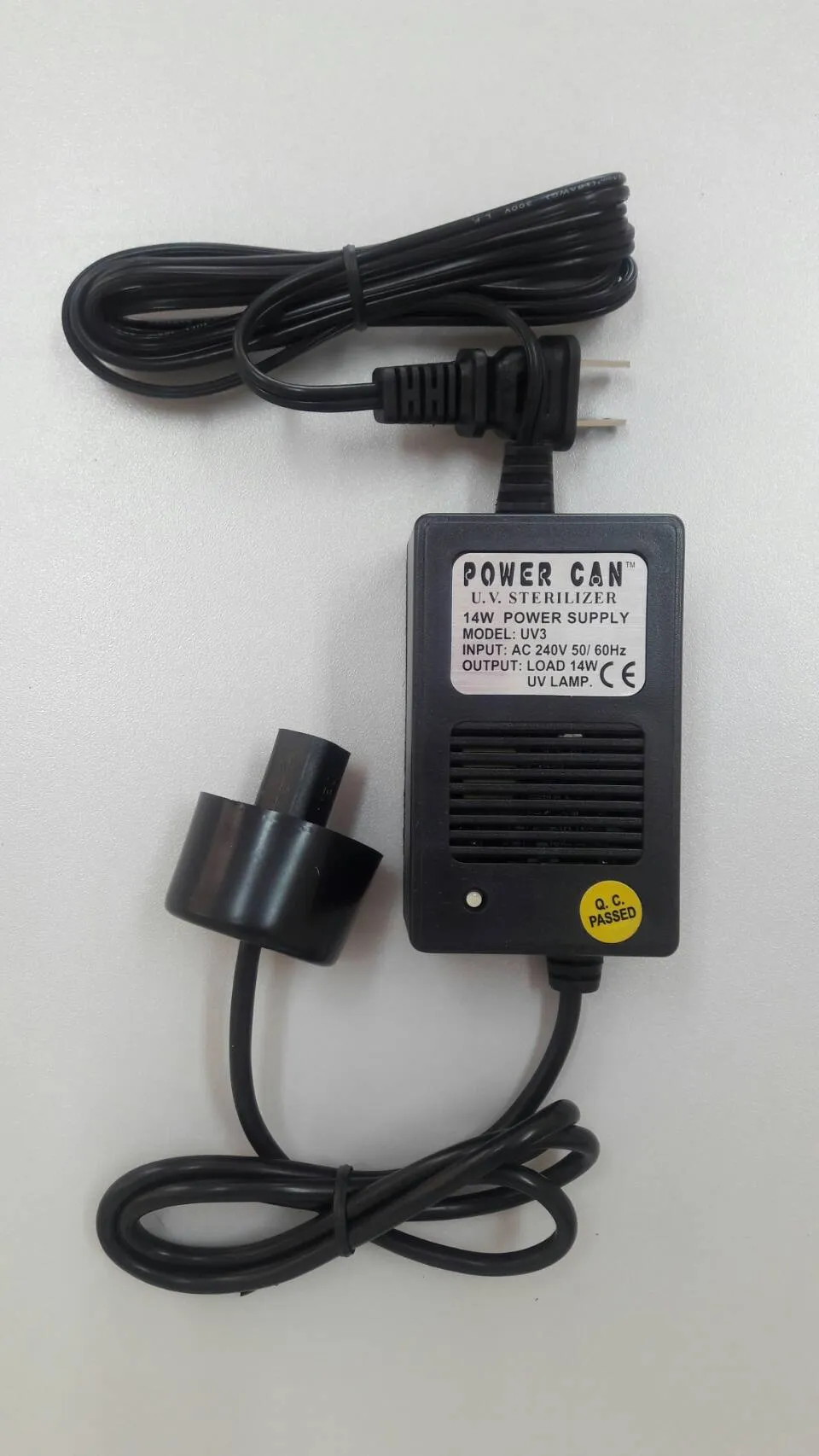 Brand : Power can Model : UV-2A ประกอบด้วย 1. หลอด UV 14W 4 ขั้ว 2. หม้อแปลง 14W 3. กระบอกสแตนเลส 10 นิ้ว 4. ข้อต่อ คลิปยด บัลลาสต์