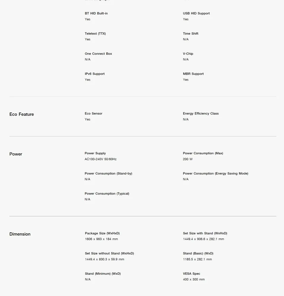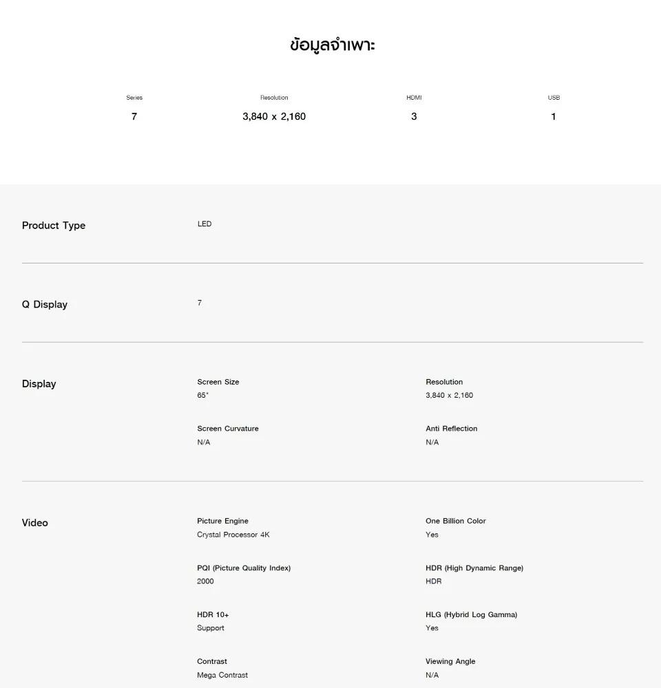 ข้อมูลเฉพาะของ (NEW 2021) Samsung Smart UHD TV 4K ขนาด 65″ รุ่น UA65AU7700