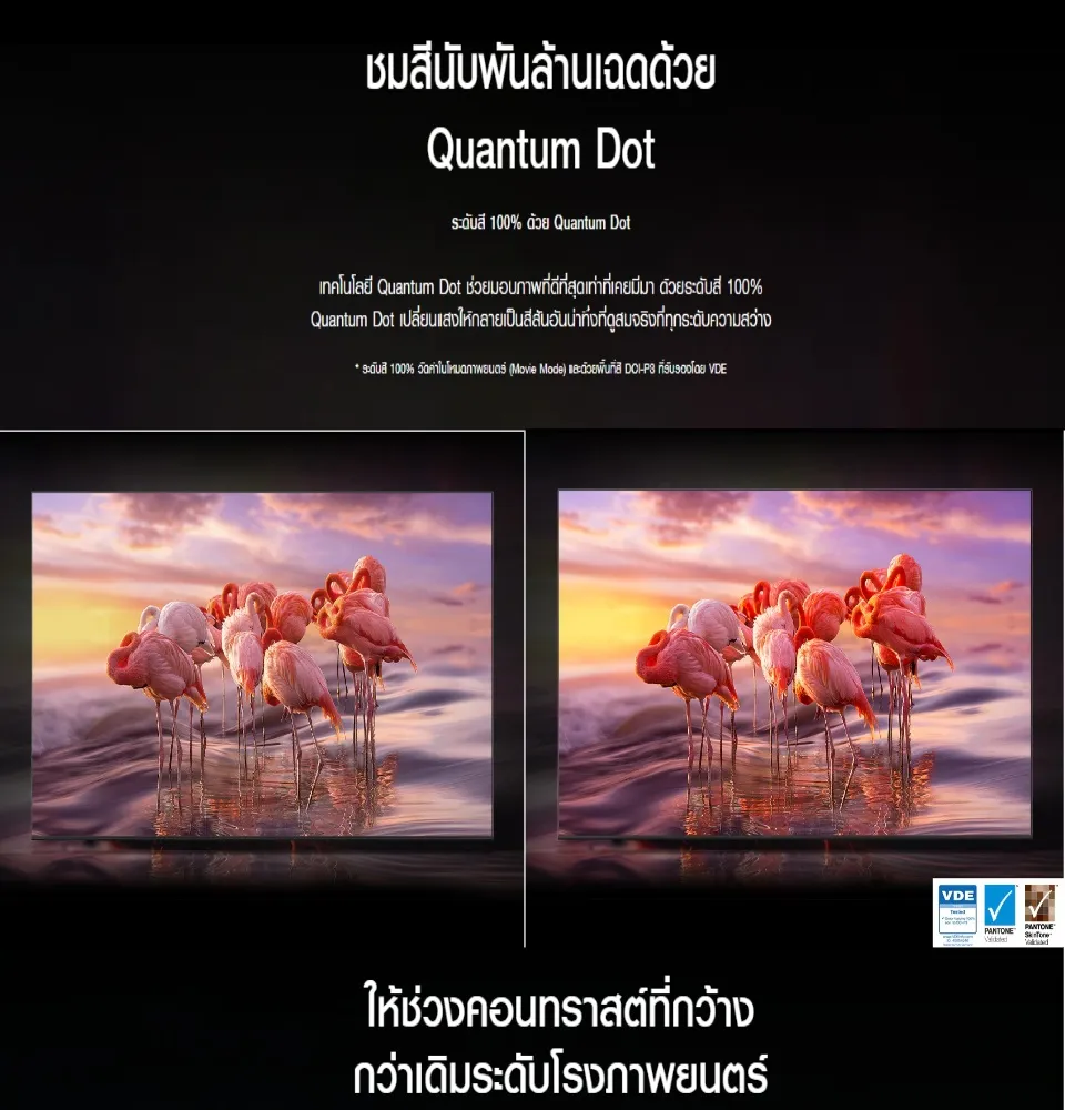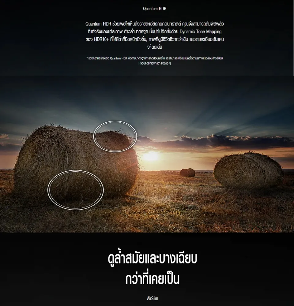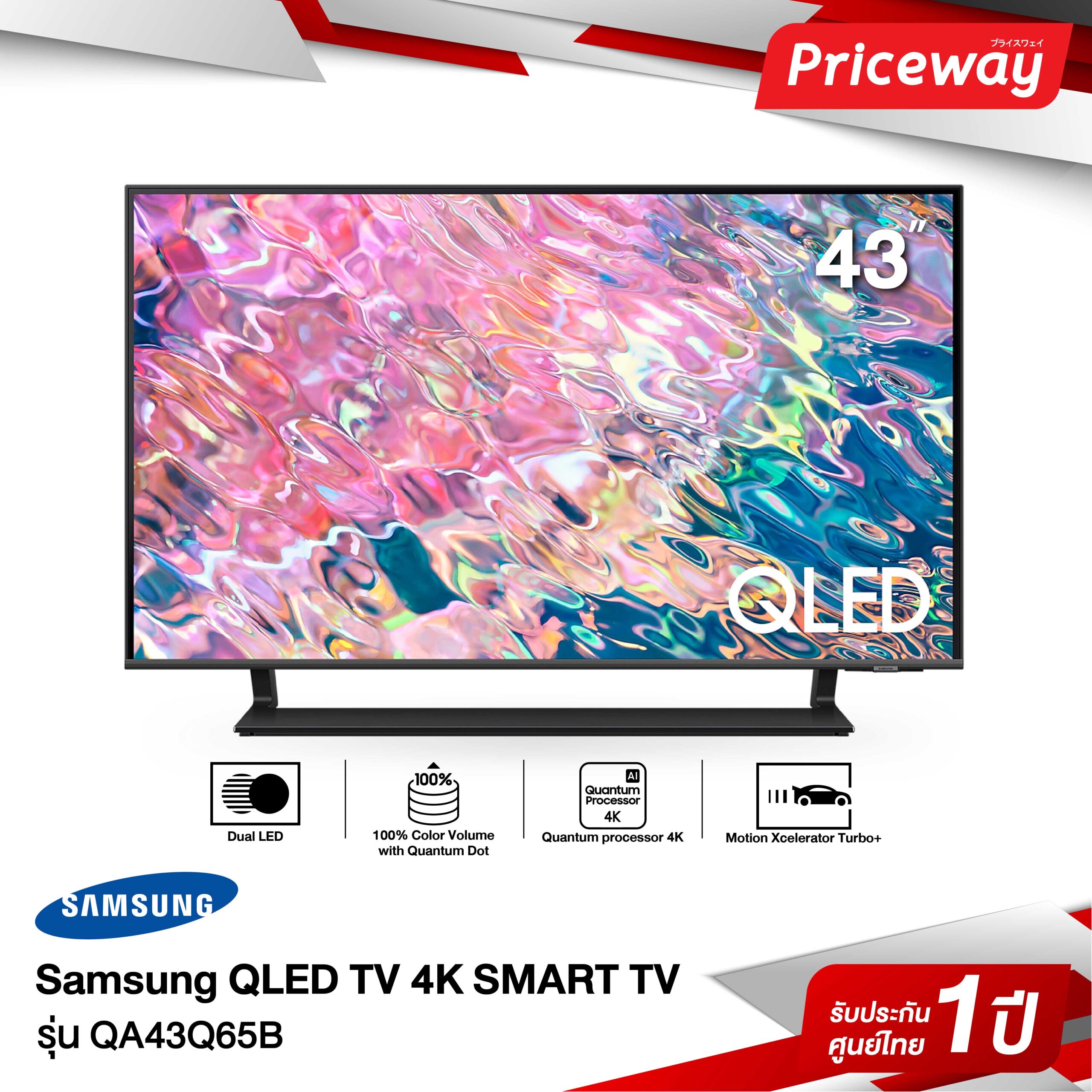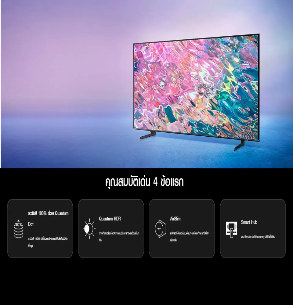 - SAMSUNG QLED TV 4K SMART TV 43Q65BA รุ่น QA43Q65BAKXXT (NEW2022)* สีสดสมจริงด้วยเทคโนโลยี 100% Color Volume Quantum Dot”* เทคโนโลยี Quantum HDR ขับรายละเอียดภาพทั้งฉากมืดและสว่าง* ดีไซน์ตัวเครื่องบาง สวยงาม ประหยัดพื้นที่ด้วย AirSlim*Dual LED : เพิ่มมิติความดำ สีสันความคมชัดเห็นรายละเอียดที่ชัดเจนPicture*ภาพคมชัดด้วยความละเอียดระดับ 4K (3,840 x 2,160) ด้วยขุมพลังชิพประมวลผล Quantum Processor Lite 4K* ภาพลื่นไหลด้วยค่า Refresh Rate 60 Hz และ Motion Xcelerator* สีสดสมจริงด้วยเทคโนโลยี 100% Color Volume พร้อมทั้งเทคโนโลยี Quantum HDR ขับรายละเอียดภาพทั้งฉากมืดและสว่าง*Dual LED : เพิ่มมิติความดำ สีสันความคมชัดเห็นรายละเอียดที่ชัดเจน* เห็นข้อมูลสำคัญและมุมมองชัดเจนในโหมดเกมส์ด้วย Super Ultrawide GameView & Game Bar 2.0Design* กรอบทีวีบางเฉียบด้วย Boundless Screen* ดีไซน์ตัวเครื่องบาง สวยงาม ประหยัดพื้นที่ด้วย AirSlim* ล้ำด้วย Solarcell Remote รุ่นใหม่ที่ชาร์ตพลังงานจากแสงอาทิตย์ แสงไฟในบ้าน หรือสัญญาณไวไฟSound* พลังเสียงรวมถึง 20 วัตต์ ชัดเจนด้วยทิศทางเสียง 2.0 ch* ด้วย Q-Symphony ลำโพงจาก TV และ Soundbar ทำงานร่วมกันเพิ่มพลังเสียง* เทคโนโลยี Object Tracking Sound Lite (OTS Lite) ทำการจำลองเสียงจากทิศทางด้านบนให้สมจริงยิ่งขึ้น* Adaptive Sound ปรับเสียงให้เหมาะสมกับคอนเทนท์นั้นๆ เช่น กีฬา หนังแอ๊คชั่น และ คอนเสิร์ตConnectivity* รองรับการเชื่อมต่อด้วย Wi-Fi 5 และ Bluetooth 5.2* สั่งงานด้วยเสียงภาษาไทยผ่านรีโมทด้วย Youtube Thai Voice Search & Google Assistant Thai Voice Search* รองรับ HDMI Version 2.0 ทั้ง 3 ช่อง และรองรับ USB จำนวน 2 ช่อง* เชื่อมต่อระหว่างทีวีกับสมาร์ทโฟนอย่างง่ายดายด้วย Tap View * เข้าถึง คอนเทนท์จาก Netflix, Disney Plus และ Browser ได้ง่ายๆ ด้วยปุ่มบนรีโมท* สามารถทำงานที่บ้านและเรียนผ่านหน้าจอทีวีได้อย่างง่ายดายด้วย Workspace (PC on TV)* ควบคุมการทำงานทีวีได้ง่ายผ่านการสั่งงานด้วยเสียงบนรีโมท Multiple Voice Assistants* สามารถแสดงผลได้ถึง 2 หน้าจอความบันเทิงในจอทีวีเดียว ด้วยฟังก์ชั่น Multi ViewDimension (mm.) W x H x D (mm) Kg.TV 965.5 x 559.4 x 25.7 8.1TV with stand 965.5 x 623.7 x 187.6 8.7All package 1093 x 677 x 129 11.9#SAMSUNG #SAMSUNG QLED TV #43q65b #QA43Q65BAKXXT #43 q65b 4k smart qled tv #QLED2022 #43Q65B